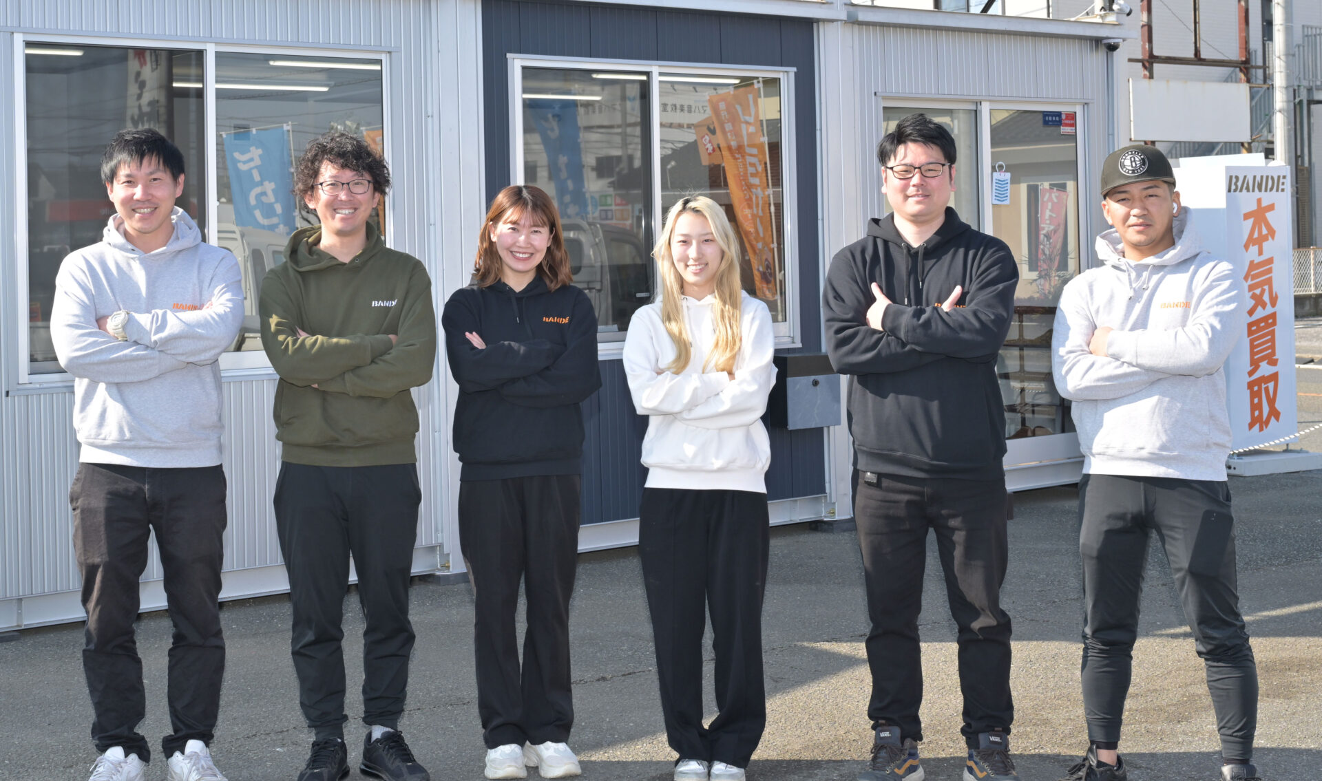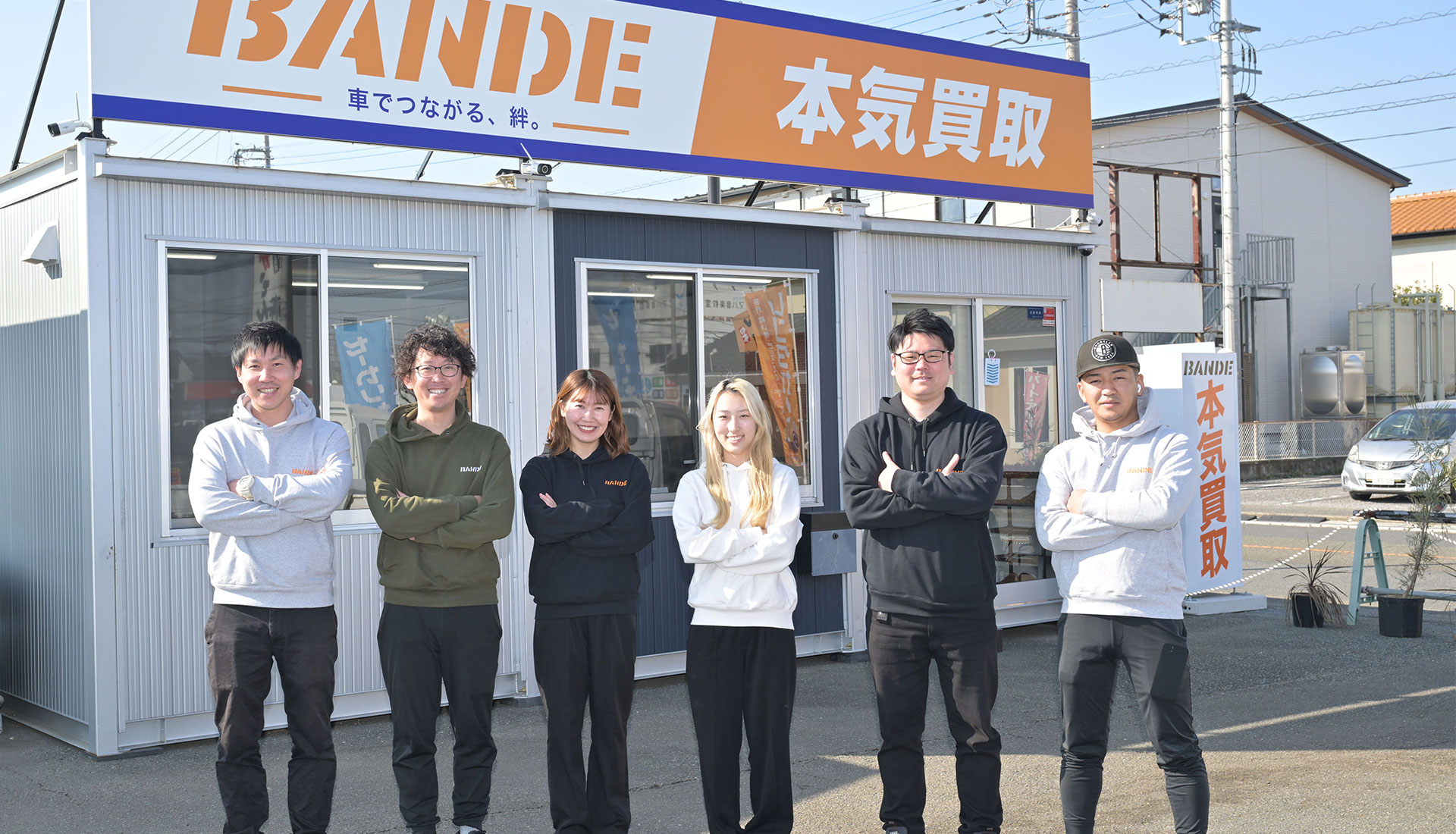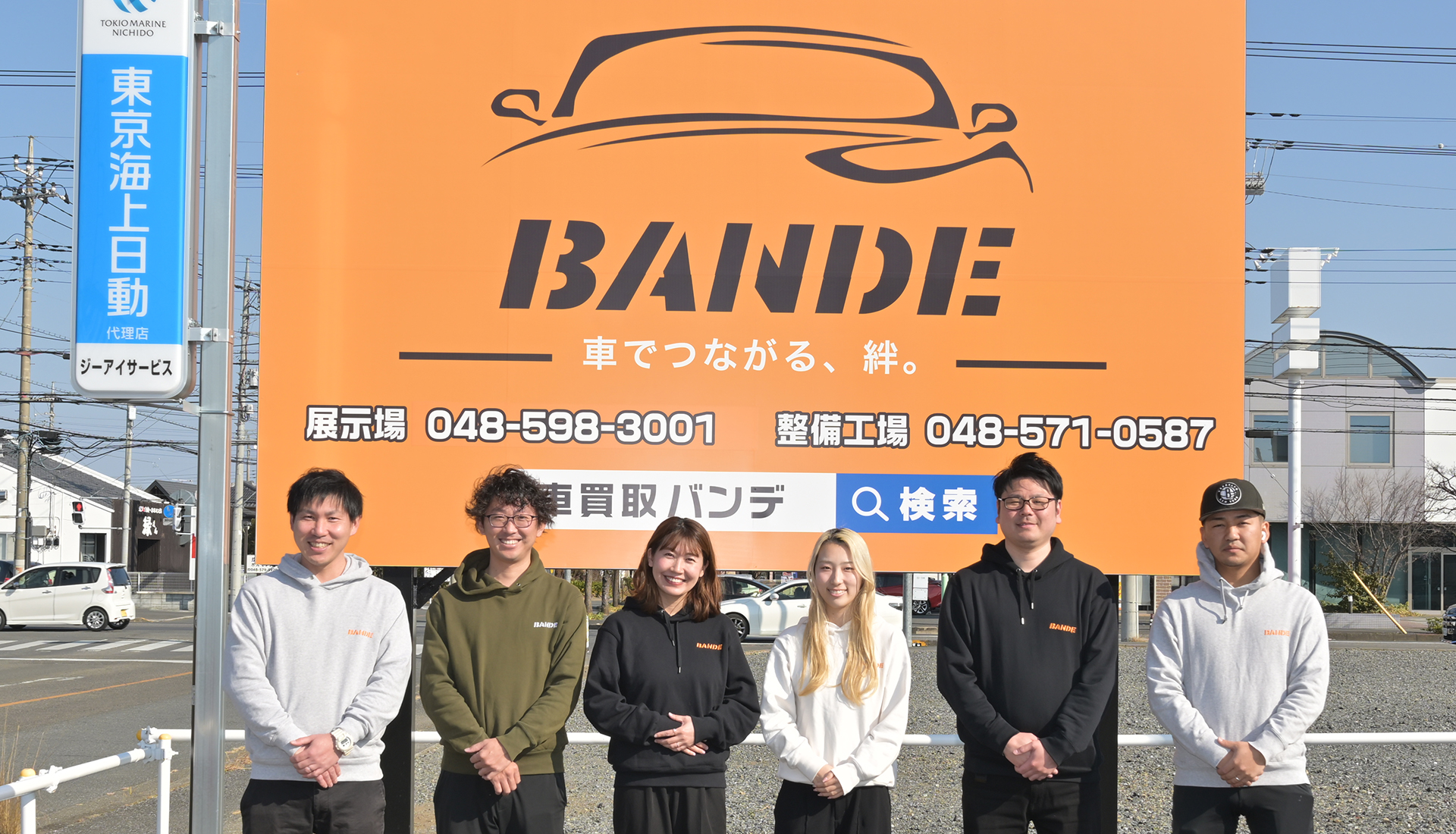 BANDE(バンデ)という言葉には、絆という意味があります。 私たちBANDEは、車を通して繋がれたお客様に安心・安全・感動・信頼を与えられるような絆づくりを積極的に進めていくチームです。 インターネットで車を購入される方が多い昨今、遠方で購入される不安をBANDEが取り除きます。遠方のお客様に限らず、地元やお近くにお住まいのお客様にも商品である車両を何度でもご覧になっていただき、信頼していただけるよう努めます。お客様から見ても風通しの良い、素直な対応を徹底して参ります。 購入時の相談、お見積金額、下取り、購入後のサポートどんなことでもお気軽にお声がけ、お問い合わせください。 自社工場完備、東京海上日動、保険代理店として自動車保険の取扱いも承っております。 経験豊富なスタッフがお客様の愛車を通じて「車で繋がる絆」を実現していきます!